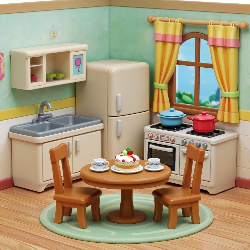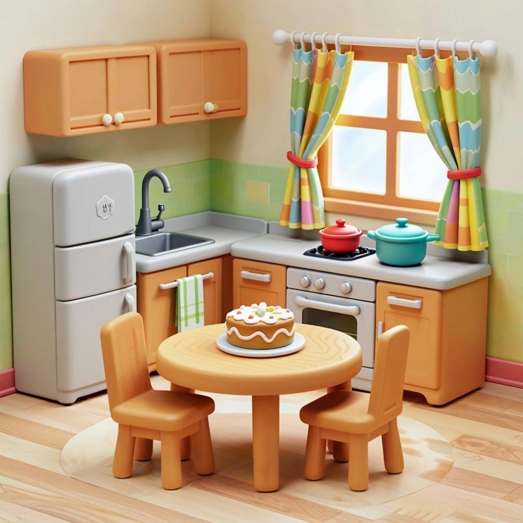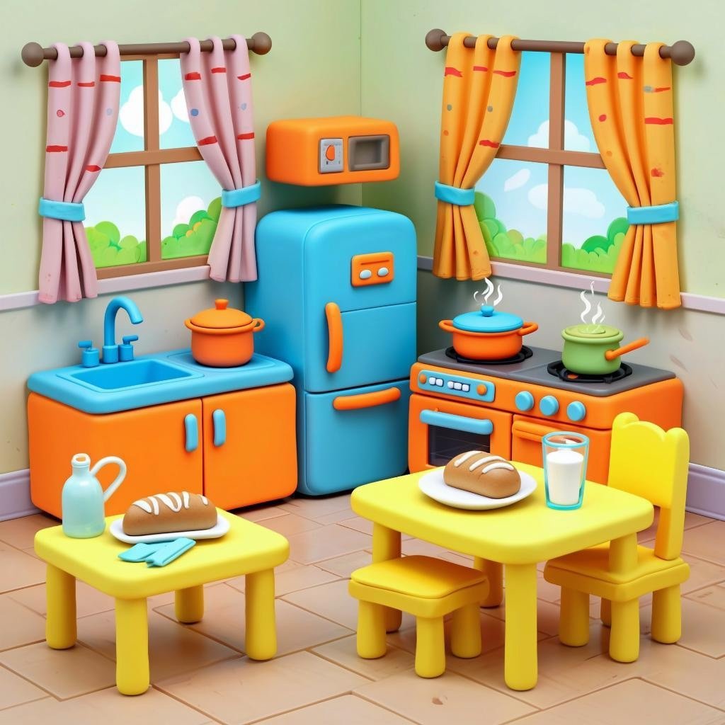 Speculation/context: The bold colors and simple shapes hint at a family kitchen designed to be cheerful and child-friendly, ideal for quick breakfasts or weekend baking.
