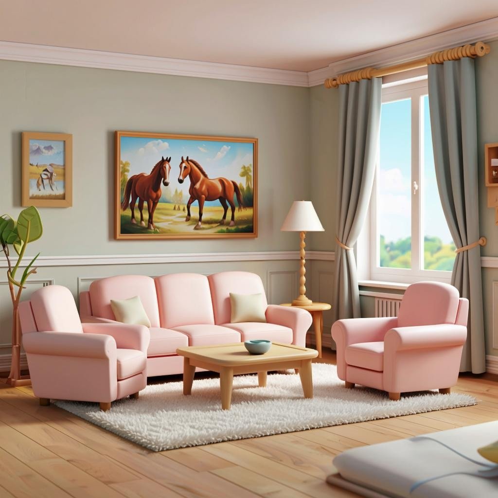 Details & position: In the foreground there’s a pale rug with a low wooden coffee table sitting in the middle. A pink sofa and two matching armchairs stand around the table, while a floor lamp is to the left of the sofa. On the wall, above the seating area, hangs a large painting of two horses. To the right, long cream curtains frame a tall window; a white radiator sits beneath it. The wooden floor and light walls make the space feel airy.