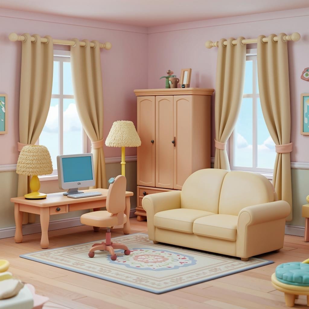 Details & position: A beige loveseat sits on the right, next to a tall wardrobe. In the center, a small desk holds a classic computer monitor and keyboard, with a table lamp beside it. A simple rug lies under the desk chair. Cream curtains hang around a window that brings in soft daylight. A second lamp stands to the left, giving the space a warm glow.