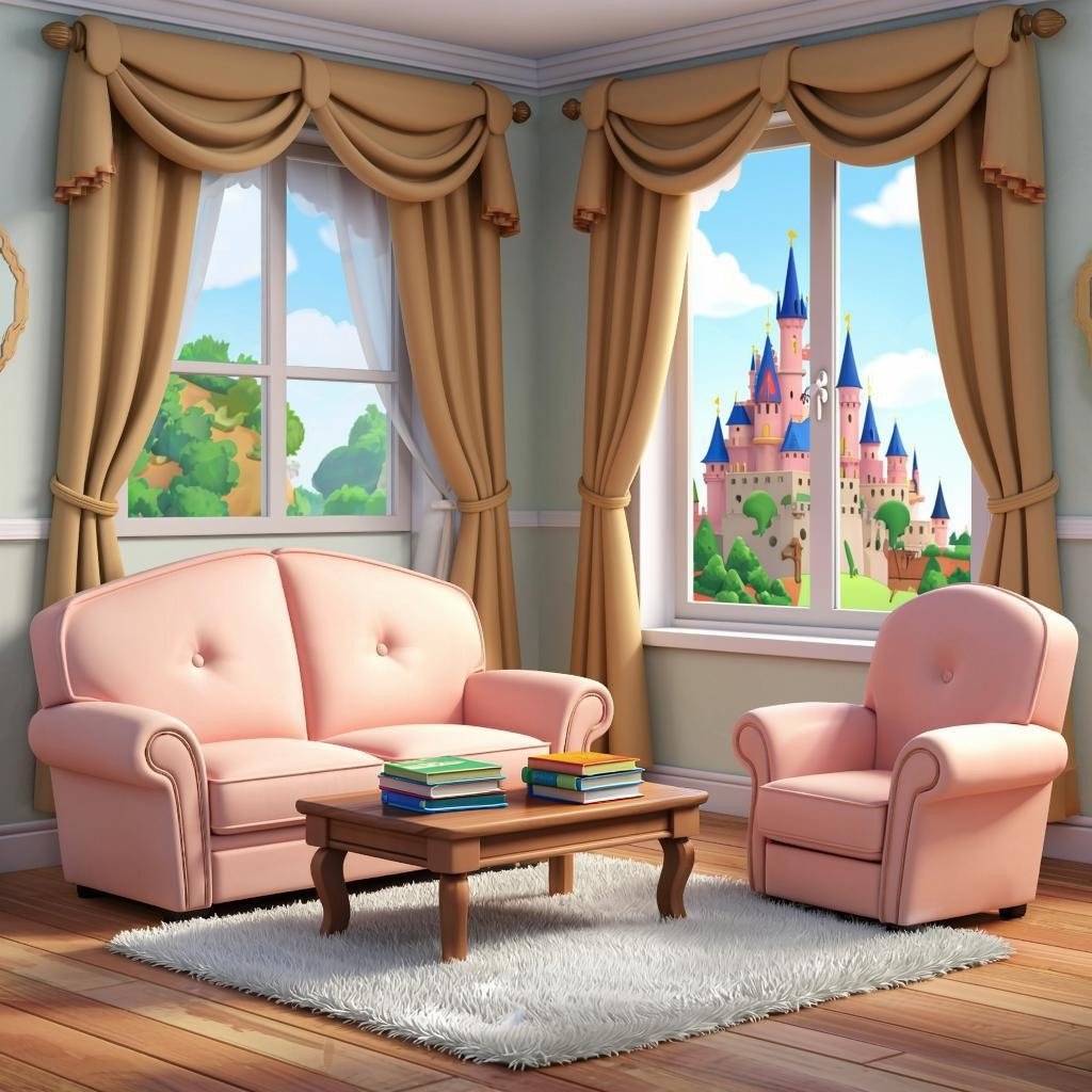 Details & position: A plush pink sofa is in the center, flanked by two rounded armchairs. A wooden coffee table rests on a light rug. The focal point is the large window behind the sofa; cream drapes open to reveal a bright view of a storybook castle and blue sky. The walls are pastel, and the room feels clean and calm.