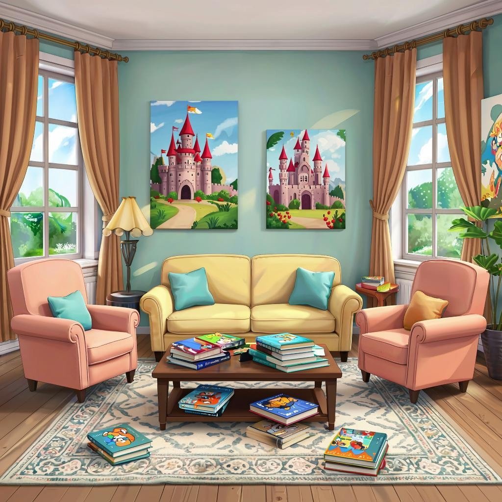 Summary: Cozy lounge facing a fairytale-style landscape.