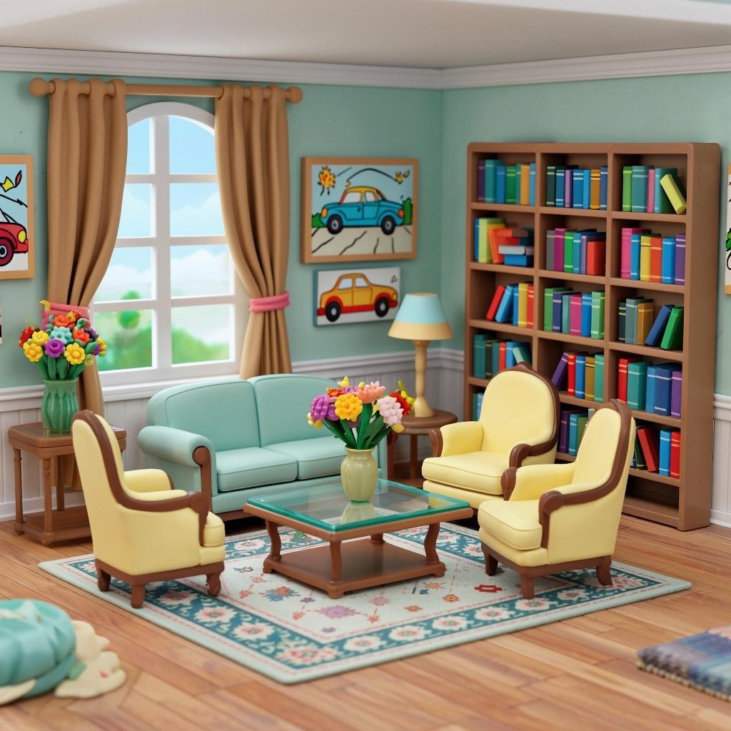 Details & position: A mint-green sofa faces two pale-yellow armchairs across a glass coffee table. Fresh flowers in a vase sit on the table, and a patterned rug lies under the seating. On the right wall, a tall bookcase is packed with colorful books; above the sofa, a framed picture of a car adds a playful touch. A wide window with beige curtains brightens the space.